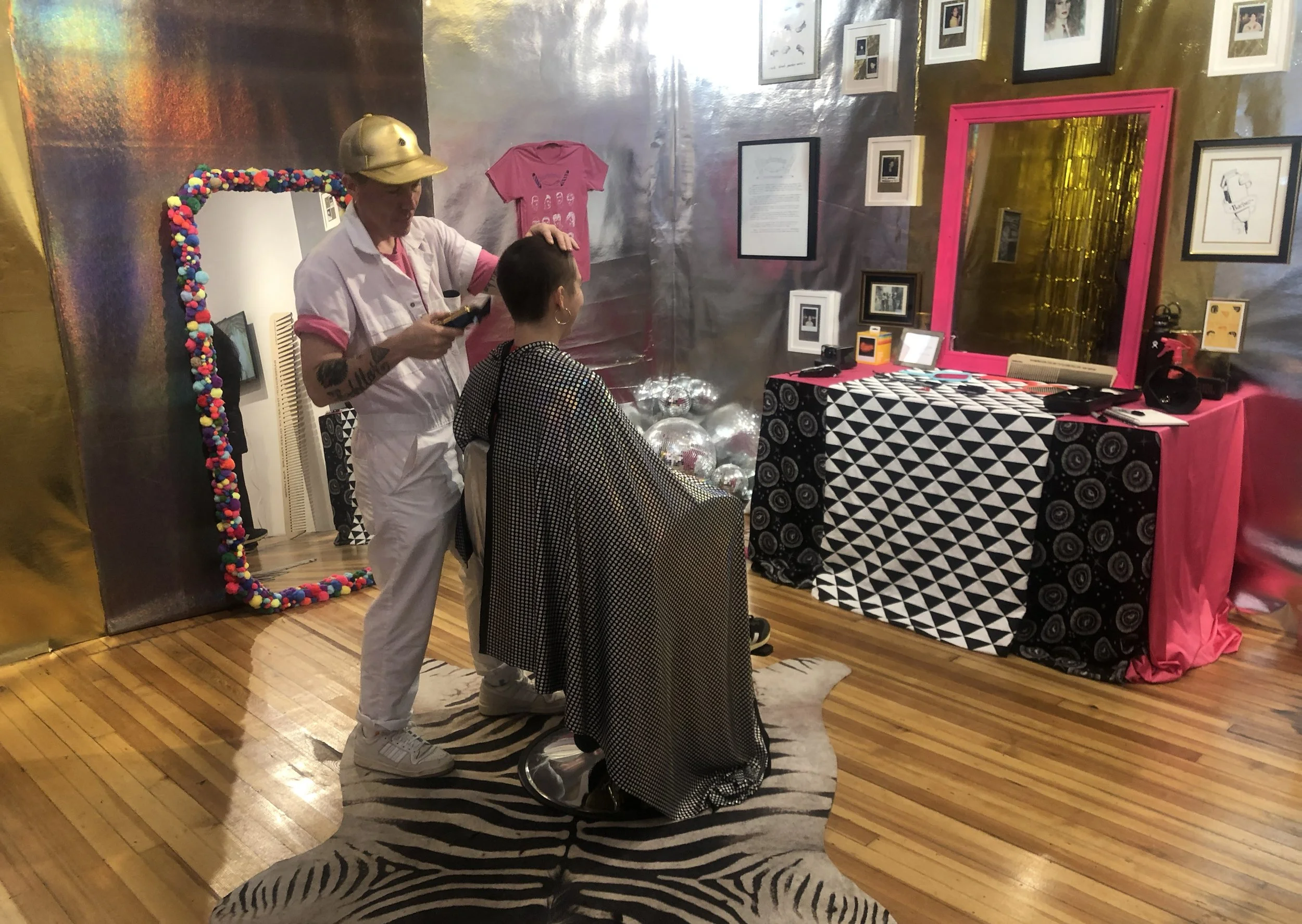 Ace Lehner’s Barbershop: The Art of Queer Failure is an installation and social practice performance that takes the motif of the barbershop and queers it, creating a space for queer world-making. The installation turns traditional barbershop decor on its head. Glitter curtains and colorful patterned textiles greet the visitor. Hand-drawn posters feature images of queer icons instead of the usual photographs of different hairstyles. The waiting area seating is strategically placed to better facilitate conversations between the artist and visitors.